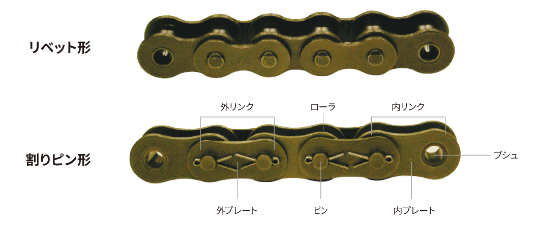 ローラチェーンは、一連の内リンクを外リンクで連結したものであります。